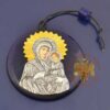 Blue Round Glass with Theotokos Metal Figure, hanging from a cord.