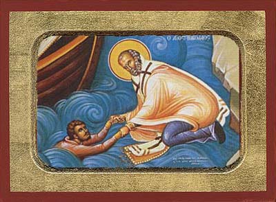 This Saint lived during the reign of Saint Constantine the Great, and reposed in 330, As a young man, he desired to espouse the solitary life. He made a pilgrimage to the holy city Jerusalem, where he found a place to withdraw to devote himself to prayer. It was made known Jo him, however, that this was not the will of God for him, but that he should return to his homeland to be a cause of salvation for many. He returned to Myra, and was ordained bishop. He became known for his abundant mercy, providing for the poor and needy, and delivering those who had been unjustly accused. No less was he known for his zeal for the truth. He was present at the First Ecumenical Council Of the 318 Fathers at Nicaea in 325; upon hearing the blasphemies that Arius brazenly uttered against the Son of God, Saint Nicholas struck him on the face. Since the canons of the Church forbid the clergy to strike my man at all, his fellow bishops were in perplexity what disciplinary action was to be taken against this hierarch whom all revered. In the night our Lord Jesus Christ and our Lady Theotokos appeared to certain of tie bishops, informing them that no action was to be taken against him, since he had acted not out of passion, but extreme love and piety. The Dismissal Hymn for holy hierarchs, The truth of things hath revealed thee to thy flock … was written originally for Saint Nicholas He is the patron of all travellers, and of sea-farers in particular; he is one of the best known and best loved Saints of all time.
