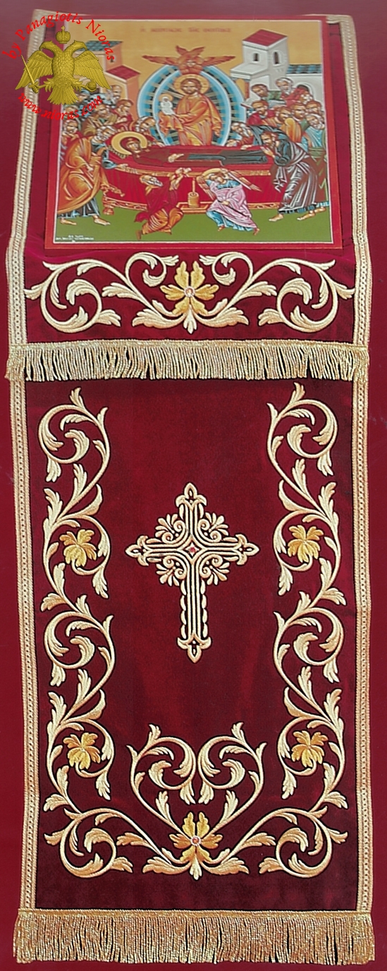 Ορθόδοξο Βελούδινο Ύφασμα για Προσκυνητάρι, με Σταυρό και Άμπελο σε χρυσαφί κλωστή.