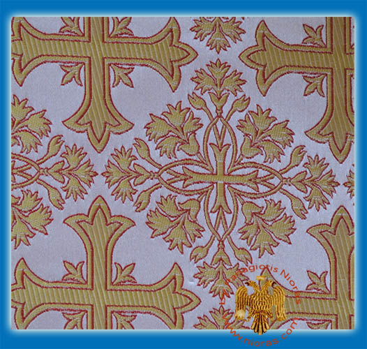 Χειροποιήτο ύφασμα για άμφια με σχέδια Σταυρού. Το ύφασμα έχει χρώμα υπόλευκο με ροζ τόνο και χρυσές λεπτομέρειες στα σχέδια.