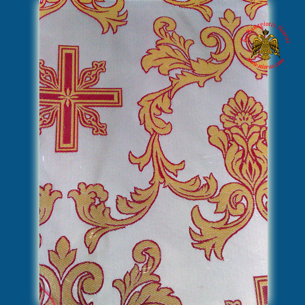 Χειροποιήτο ύφασμα για άμφια με σχέδια Σταυρού. Το ύφασμα έχει χρώμα Λευκό με Κίτρινα – Χρυσα Σχέδια – ΑΡΧΩ