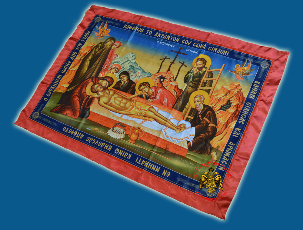The icon depicts Christ after he has been removed from the cross, lying supine, as his body is being prepared for burial. The scene is taken from the Gospel of St. John 19:38-42. Shown around him, and mourning his death, may be his mother (the Theotokos; John the beloved disciple; Joseph of Arimathea; and Mary Magdalene, as well as angels. Nicodemus and others may also be depicted. Sometimes, the body of Christ appears alone, except for angels, as if lying in state.[1] The oldest surviving embroidered icon, of about 1200 (Venice) is in this form. The equivalent subjects in the West are called the “Anointing of Christ’s body”, or Lamentation (with a group present), or the Pietà , with just Christ held by Mary.