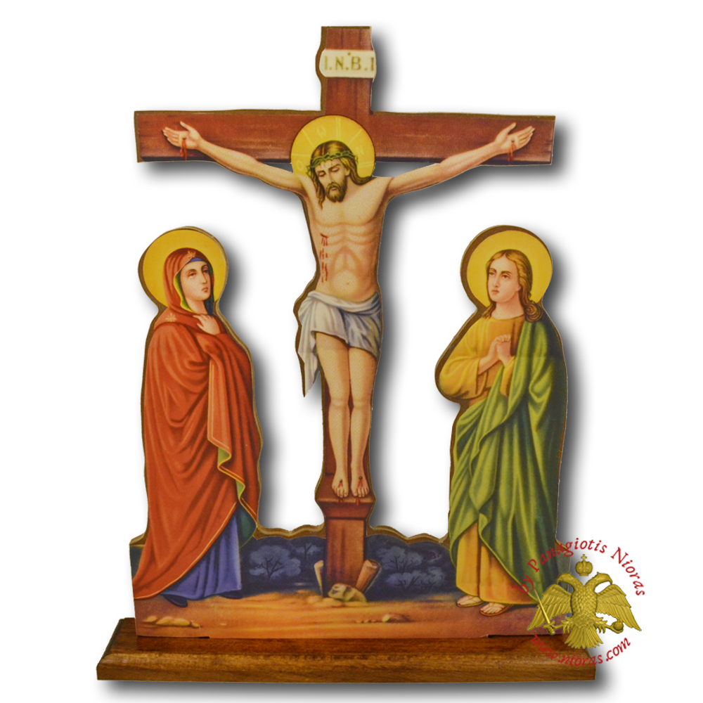 Orthodox Wooden Byzantine Cross Representation of Crucifixion Golgotha with Holy Virgin Mary Theotokos and Saint John the Evangelist Lipiteron