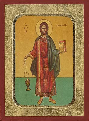 This Saint, who was born in Spain, was the Archdeacon of the Church of Rome, caring for the sacred vessels of the Church and distributing money to the needy. About the year 257, a harsh persecution was raised up against the Christians by Valerian. Pope Sixtus, who was from Athens, was commanded to worship the idols, and refused; before his martyrdom by beheading, he committed to Laurence all the sacred vessels of the Church. When Laurence was arrested and brought before the Prefect, he was questioned concerning the treasures of the Church; he asked for three days time to prepare them. He then proceeded to gather all the poor and needy, and presented them to the Prefect and said, “Behold the treasures of the Church.” The Prefect became enraged at this and gave command that Laurence be racked, then scourged with scorpions (a whip furnished with sharp iron points), then stretched out on a red-hot iron grill. But the courageous athlete of Christ endured without groaning. After he had been burned on one side, he said, “My body is done on one side; turn me over on the other.” And when this had taken place, the Martyr said to the tyrants, “My flesh is now well done, you may taste of it.” And when he had said this, and had prayed for his slayers in imitation of Christ, he gave up his spirit on August 10, 258.