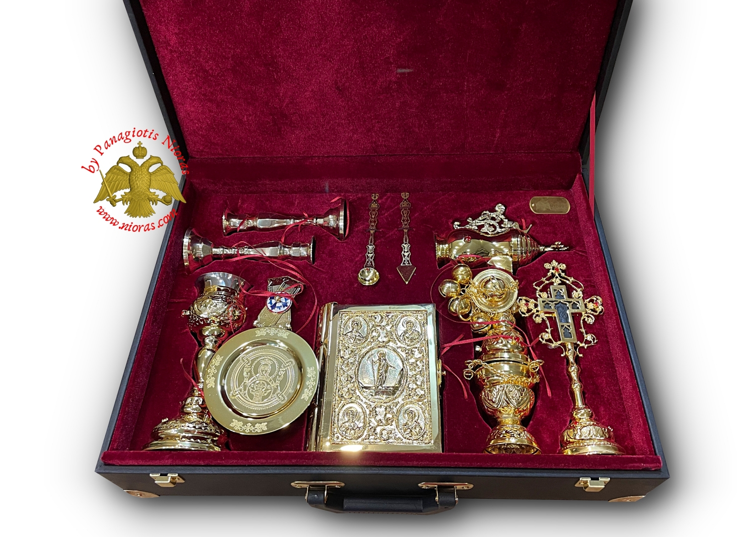 The kit contains Cross Blessing, chalice, paten, asterisk, tongs, Lance, Gospel, Boiling Zeon, Censer and Candlestick.