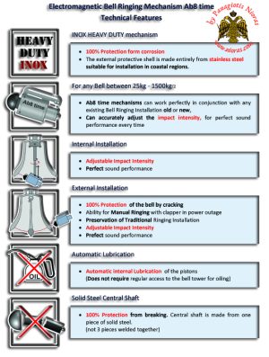 The Electromagnetic Orthodox Bell Hammer can be installed internally or externally of any existing bell without the use of specialise tools and can accurately adjust the impact intensity, for perfect sound performance every time in every bell.