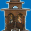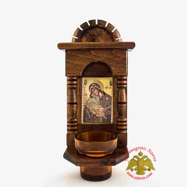 Hand Made Icon with Glass Oil Cup, in Natural Wood, with the Image of Theotokos.