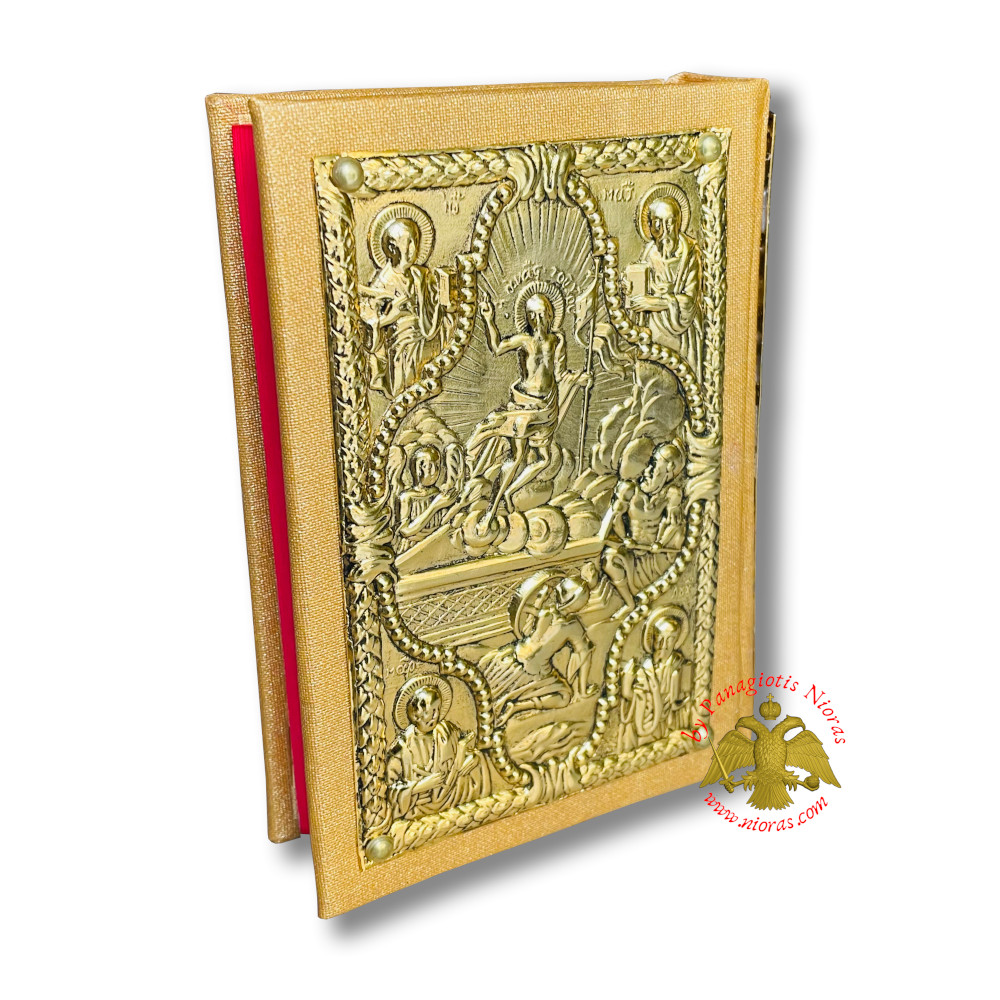 Hand Made Gold Plated Holy Gospel with the Crucifixion in the front and the Resurrection on the back side.