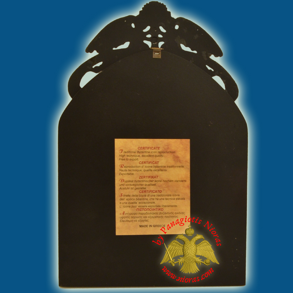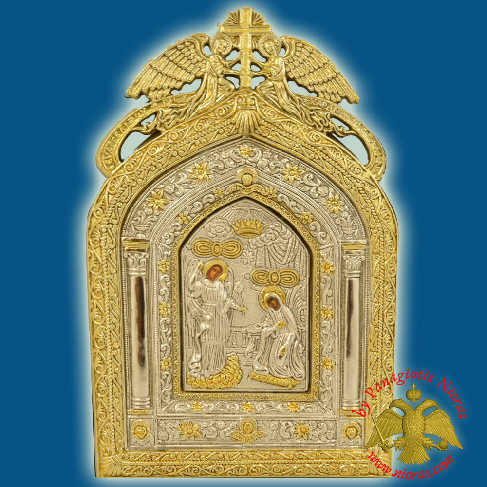 This icon is the exact copy of the original icon as you can find in the Temple of the Annunciation in the island of Tinos with Gold Plated Angels frame