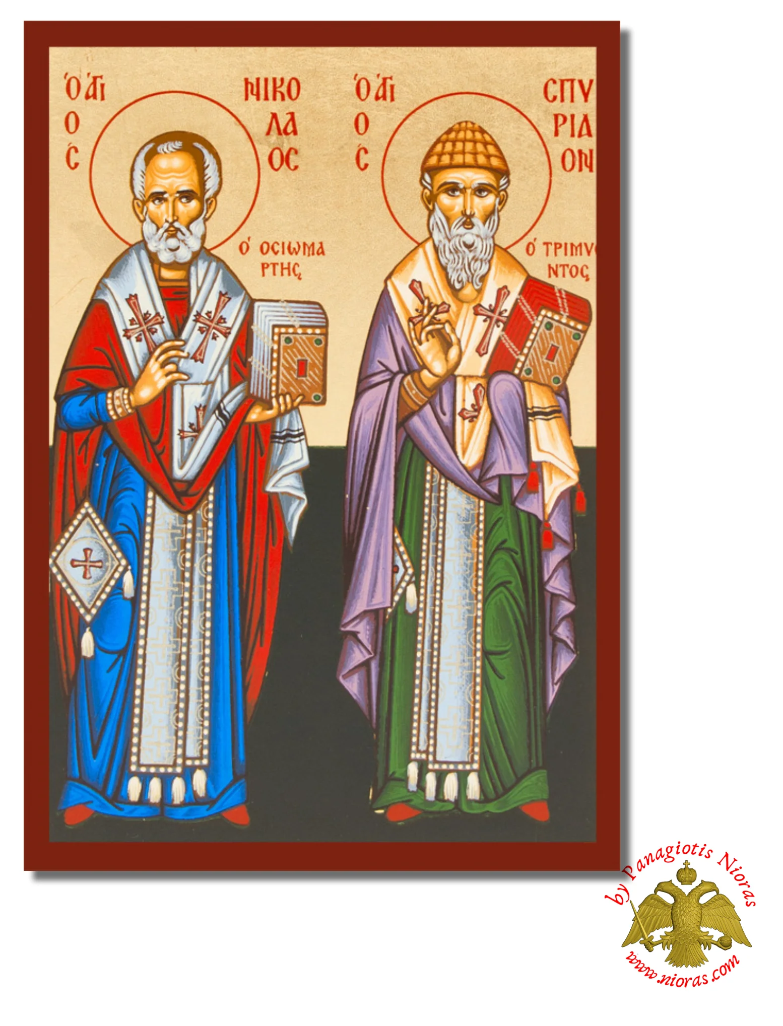 Hand Made Τhe Saints Spyridon and Nicholas Byzantine Wooden Icon on Canvas.